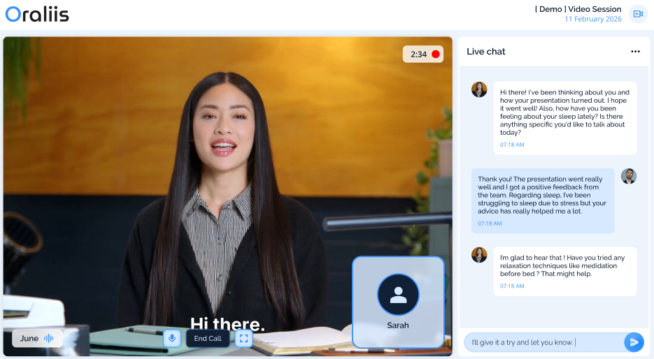 Talk however feels natural: live video sessions, quick voice notes or chat.